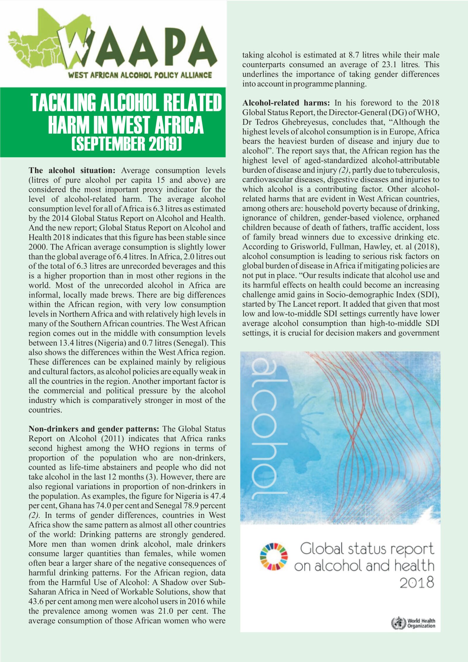 Resource Hub GhanAPA Operational documents & Reports Annual Reports Ghanapa Annual Report 2024Ghanapa Annual Report 2023Ghanapa Annual Report 2022Ghanapa Annual Report Final 2020 Ghanapa Annual Report Final 2019 Constitution Ghanapa Constitution POW Ghanapa 2023 Plan Of Work (Pow)Ghanapa Program Of Work 2025 GhanAPA Campaign Materials Alcohol Harm and Interventions Alcohol Harm and Interventions Media Discussions Highlight on Alcohol Control. Alliances Campaign Materials Liberia Shadow report National Documents National Alcohol Policy National Health Policy Public Health Act 851 NCD Policy FDA Guidelines Excise Duty (Amendment) (No 2) Act, 2023 (Act 1108) Policy Brief on Alcohol Regulation Regional, Global Documents and Best Practices AFRO Alcohol Policy Framework AFRO GAAP Framework Global Alcohol Action Plan Global Status Report on Alcohol and Health Waapa Technical Paper (Tackling Alcohol Harm In West Africa)